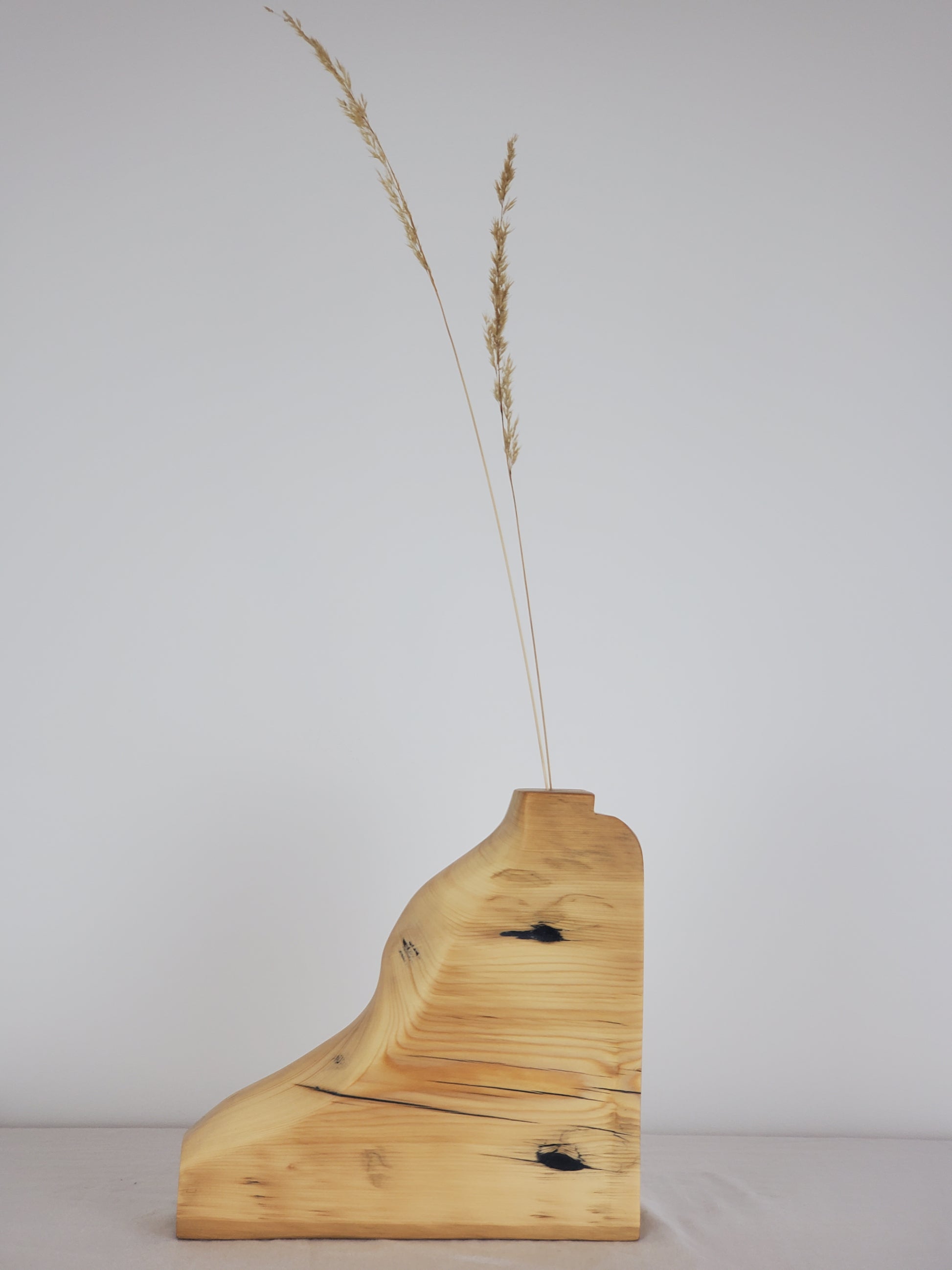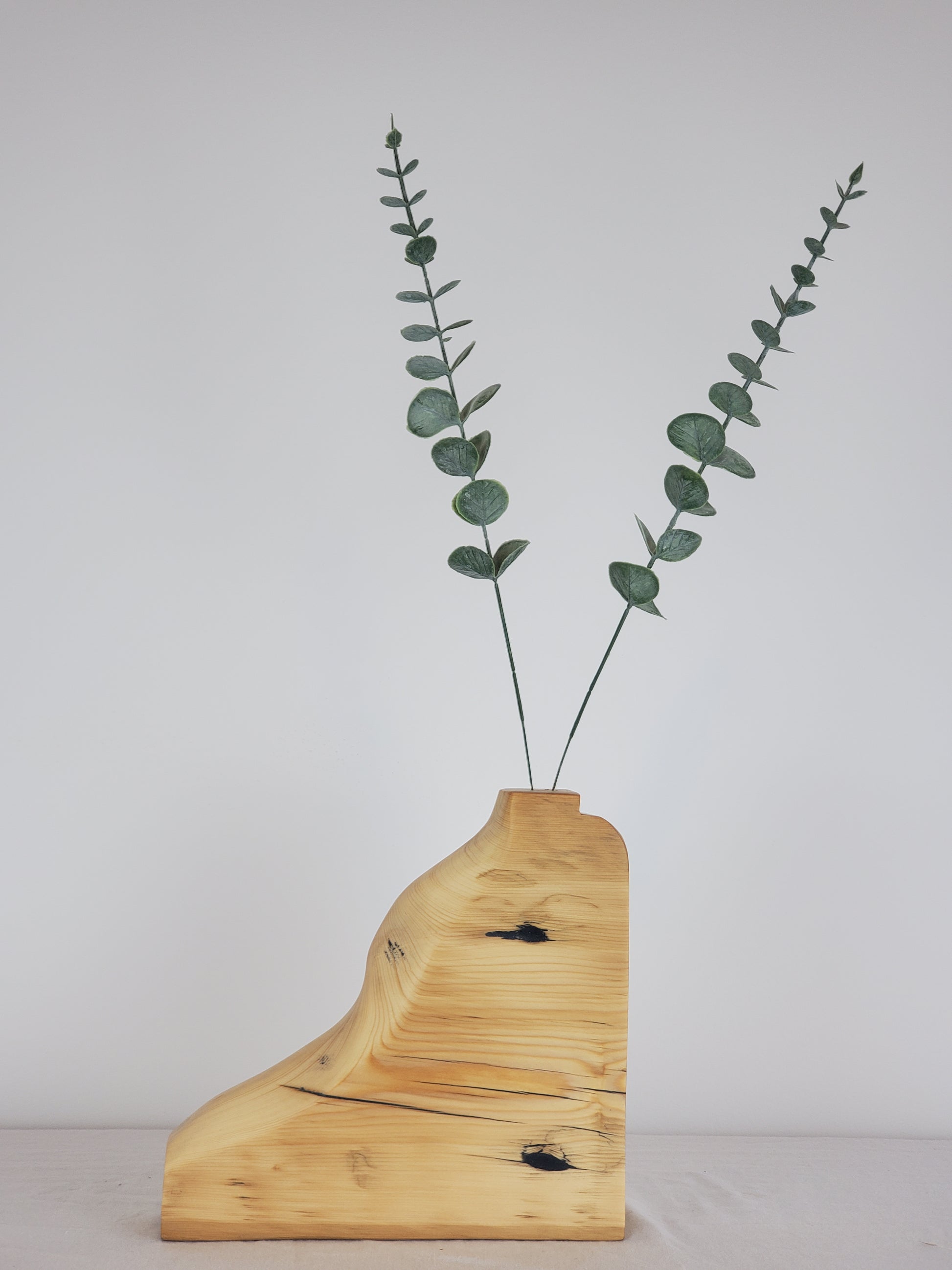 Say hello to Step Right In, Bud Vase 005 in my bud vase collection. Your new favorite way to give blooms, buds or branches a warm welcome. This bud vase is made from reclaimed wood, filled with a sleek black pigmented filler that makes the grain pop. Its playful shape adds a smile wherever you place it, while the contrast of the curved and crisp lines keeps things stylish.